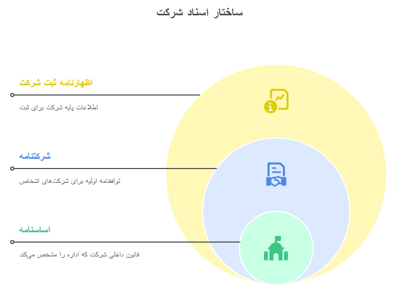 شرکتنامه سند اولیه برای شرکتهای اشخاص است و اطلاعات پایهای شرکا و سرمایه اولیه را ثبت میکند و اساسنامه جزئیات اداره شرکت را تکمیل میکند.