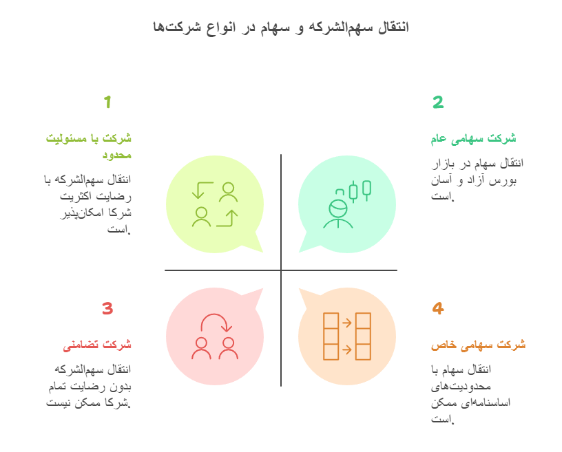 در شرکتهای سهامی (خاص و عام)، انتقال سهام سادهتر و آزادانهتر انجام میشود.