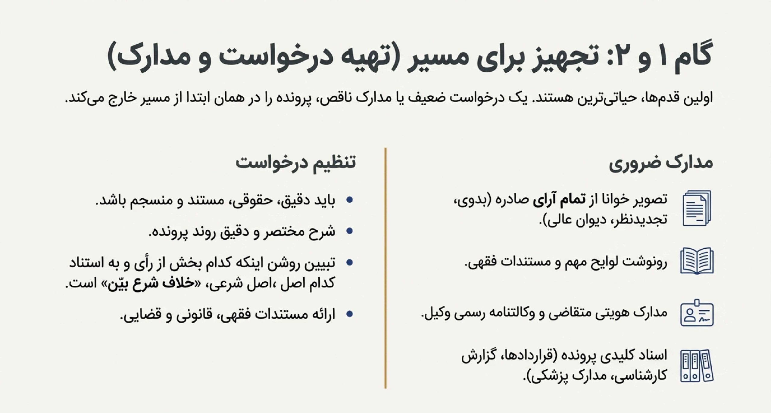• مدارکی شامل حکم قطعی، مستندات خلاف شرع بودن حکم و دلایل کافی برای درخواست تجدید نظر باید ارائه شوند.